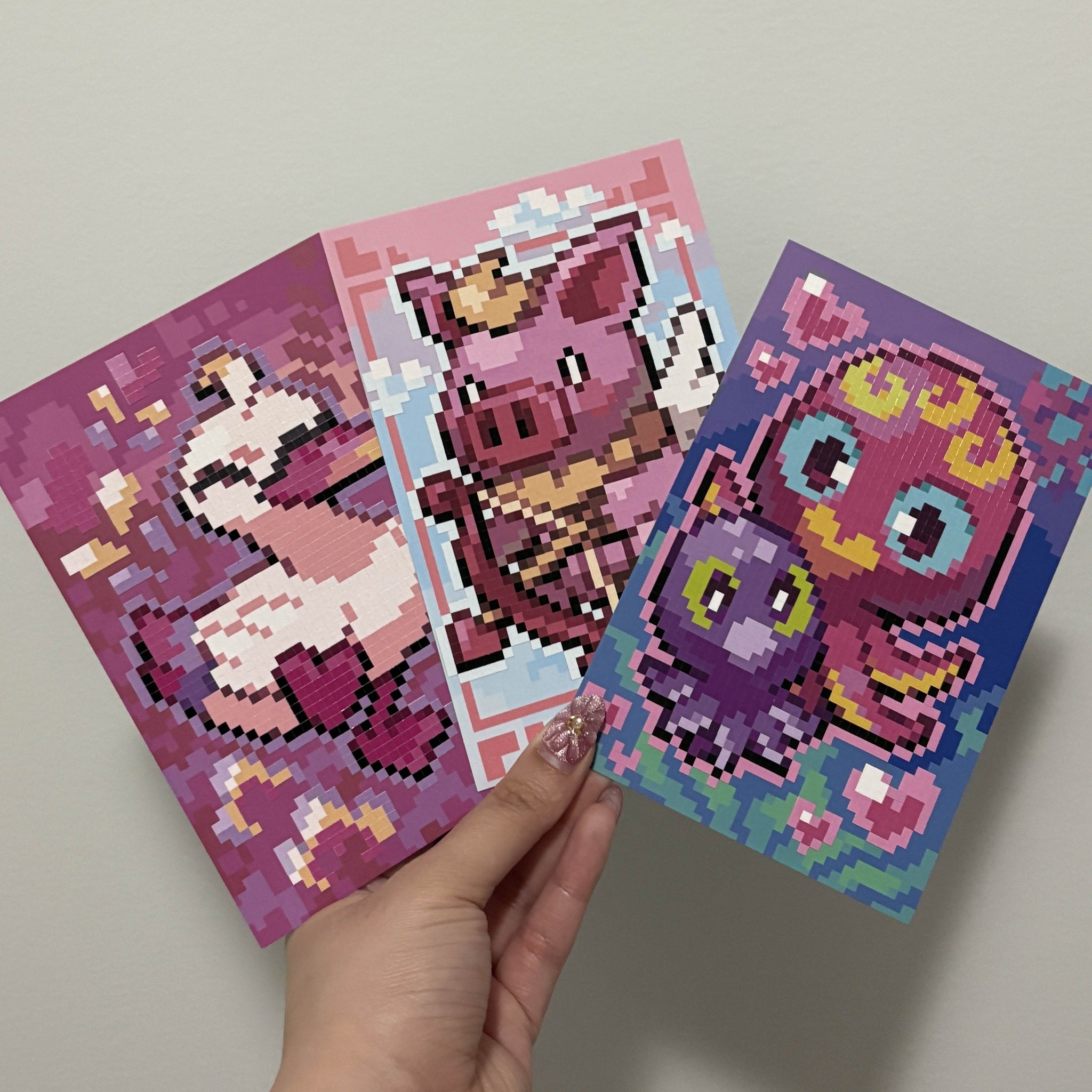 Each set includes three unique collectible cards, illustrated exclusively by real pixel artists (never AI) and brought to life with our premium glossy vinyl stickers. Just like building a trading card, you’ll place each sticker piece by piece, transforming a simple card into a vibrant, finished artwork that feels both nostalgic and new.