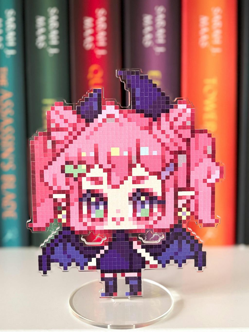 Each standee begins as a flat acrylic piece, then transforms into a vibrant collectible as you apply premium glossy vinyl stickers, carefully designed by real artists. Watching your character or design take shape pixel by pixel is a mindful process that blends relaxation with creativity.